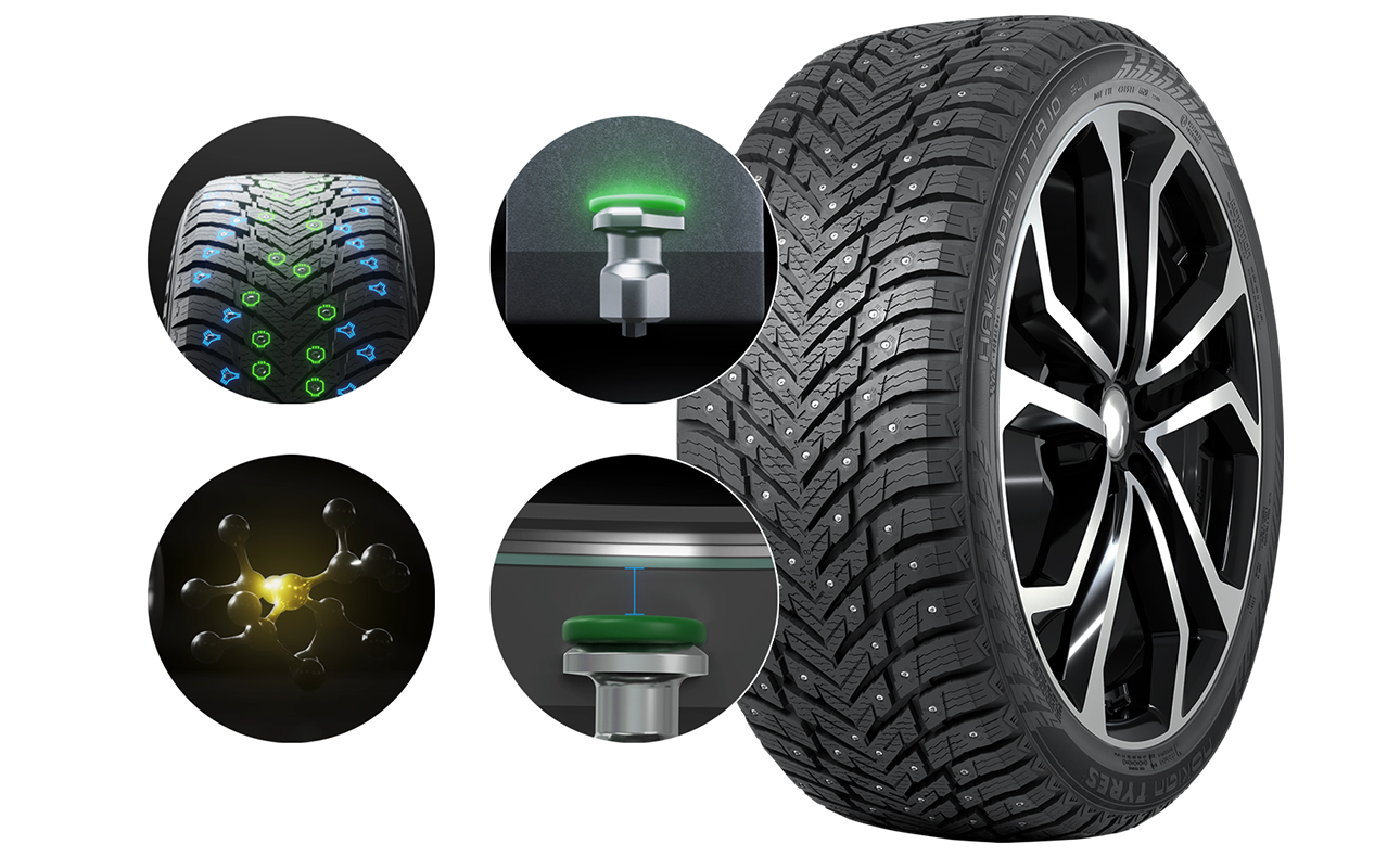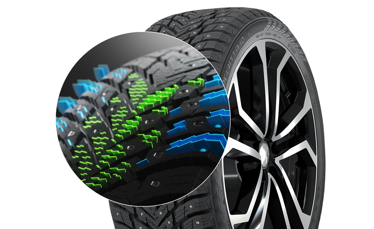 Зимние шипованные шины Nokian Tyres Hakkapeliitta 10 для суровых условий, разработанные чтобы обеспечивать безопасность на зимних дорогах. Модель сочетает в себе отличное сцепление, комфорт и экологичность. Технология двойной ошиповки создана для максимальной безопасности на льду и снегу, центральные шипы служат для усиления динамичности и торможения, а плечевые шипы — участвуют в стабилизации автомобиля на поворотах.